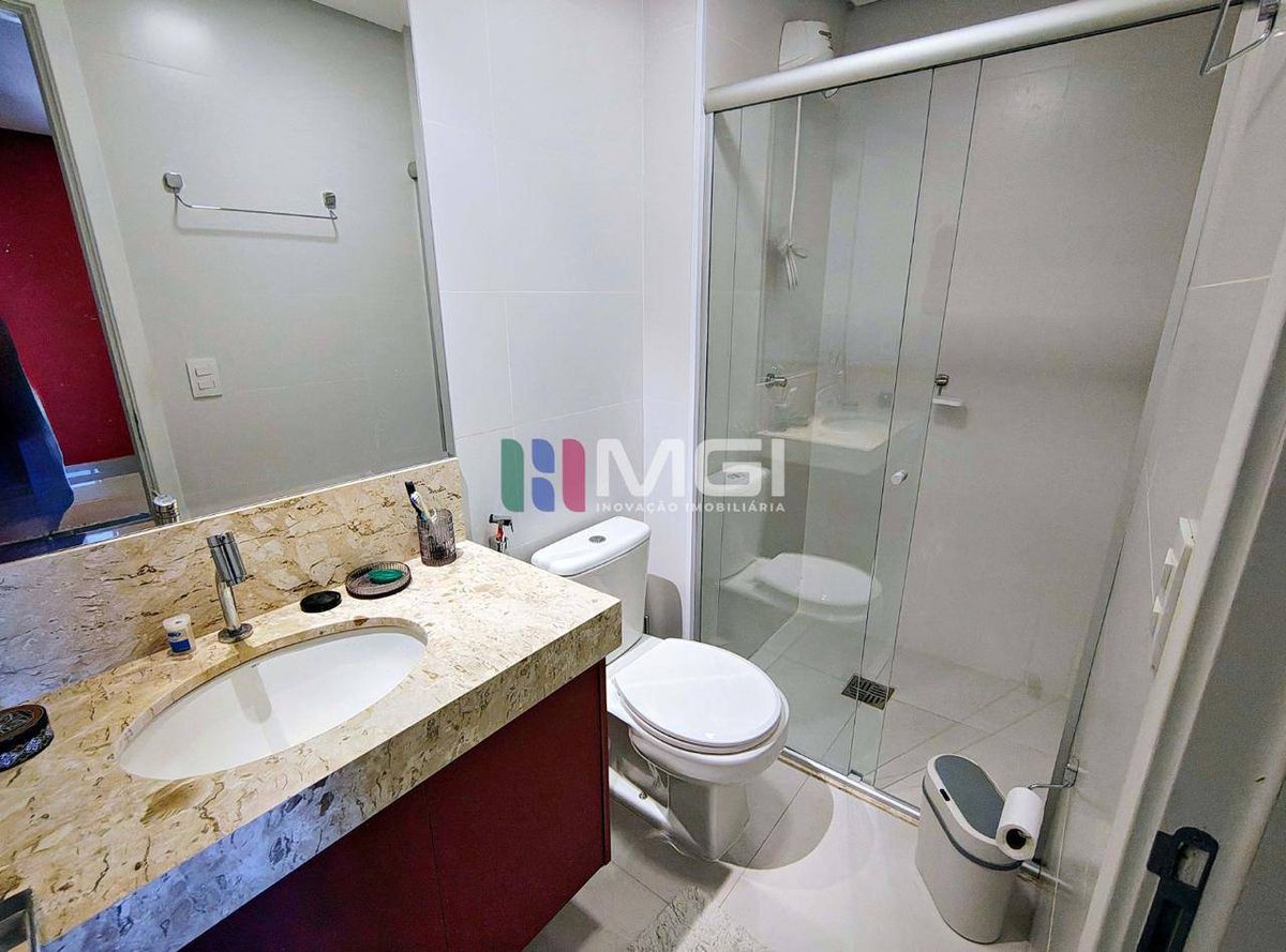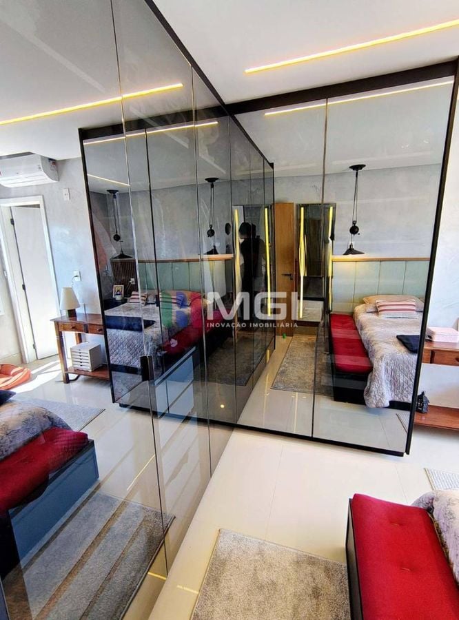 O apartamento conta com três suítes, todas com ar-condicionado, sendo a suíte master um verdadeiro refúgio: armários espelhados,