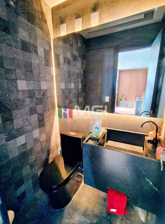 O apartamento tem ainda uma lavanderia com armários pretos e pia em granito preto Gabriel, além de duas vagas de garagem paralelas.