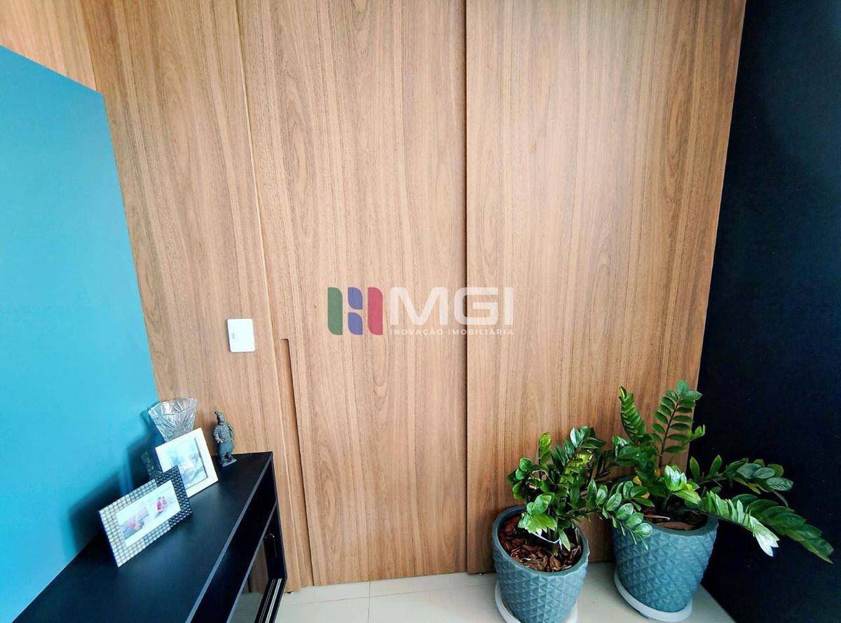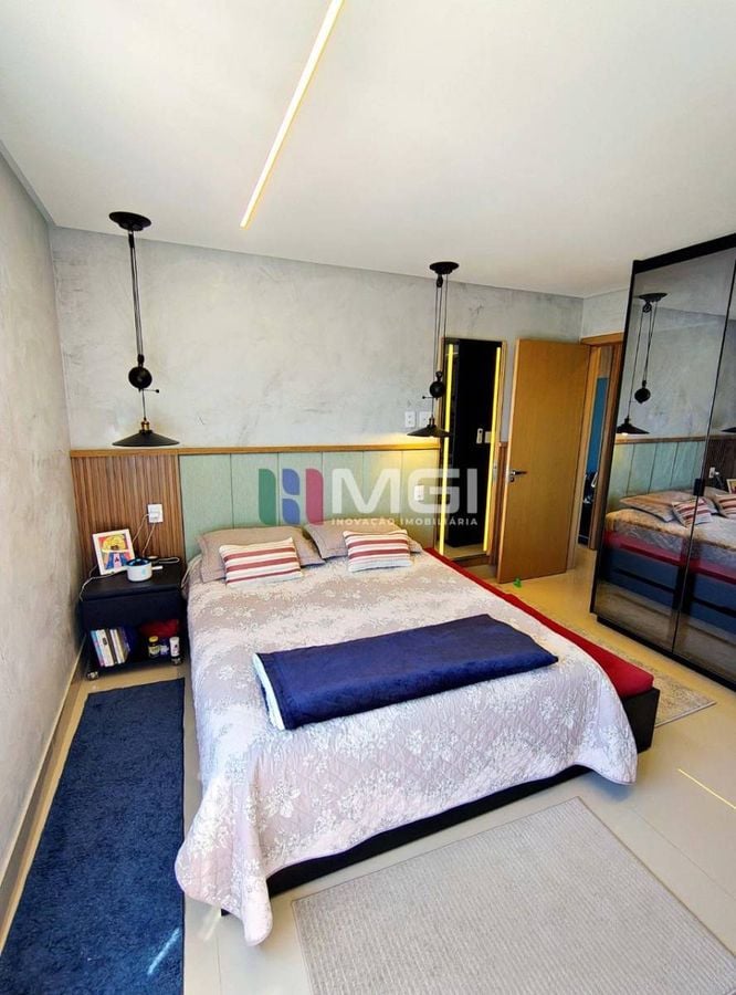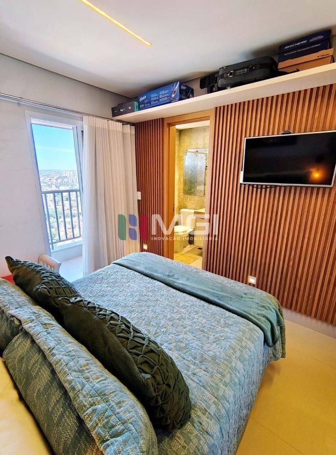 A segunda suíte tem armários, espelho, painel ripado em madeira ecológica, iluminação em LED e varanda técnica com vista livre para a T-9.