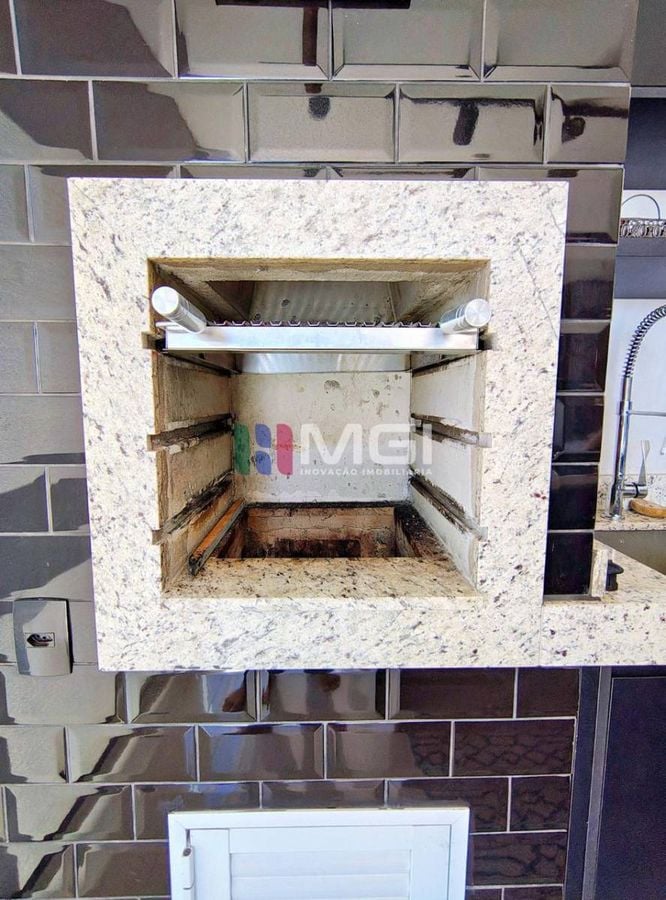 A varanda gourmet tem churrasqueira, pia gourmet com torneira moderna, ilha de apoio em granito e uma mesa de madeira de demolição feita sob medida por designer renomado.