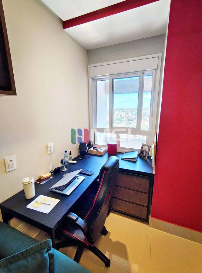 A terceira suíte foi transformada em um escritório/biblioteca, com armários e painel em aço e madeira, bancada de trabalho com vista para a janela,