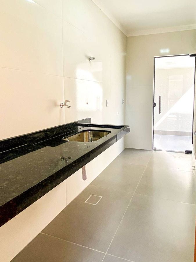 Piso Ornare Extra Ceral 82×82 e bancadas em granito Verde Ubatuba